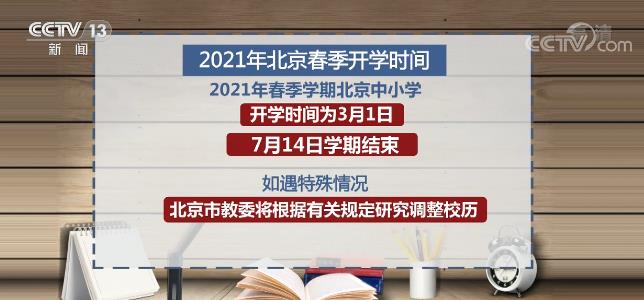 2021年春季学期北京中小学开学时间为3月1日,7月14日学期结束,如遇特殊情况,北京市教委将根据有关规定研究调整校历。