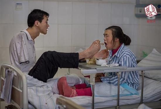 楚天都市报11月5日讯(楚天都市报记者陈俊 摄影记者朱熙勇 视频剪辑鲁立 )“妈妈,张嘴,吃饭啦……”10月20日,恩施州湖北民院附属民大医院里,29岁的无臂青年陈兹方,唤起病床上意识模糊的母亲鲁冬月,用双脚熟练夹起碗筷和勺子,将饭菜轻轻地送到母亲嘴前。听到儿子的呼唤,鲁冬月慢慢张开嘴,一口一口地吃了起来。