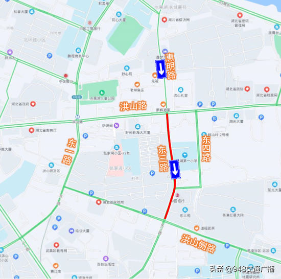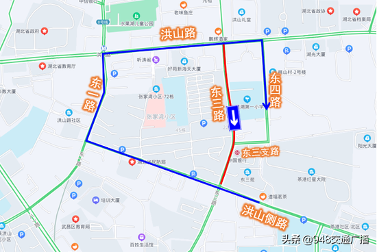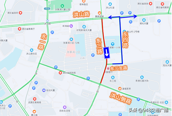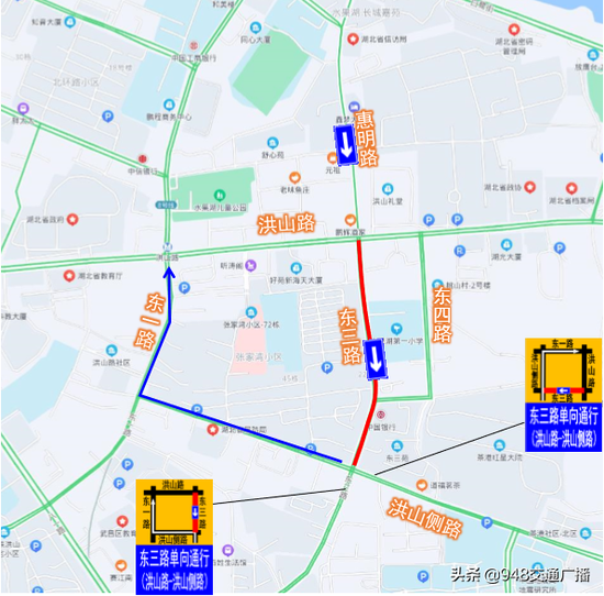 2月8日至4月30日,东三路施工期间,东三路(洪山路至洪山侧路)改变为由北向南(洪山路往洪山侧路方向)单向通行。