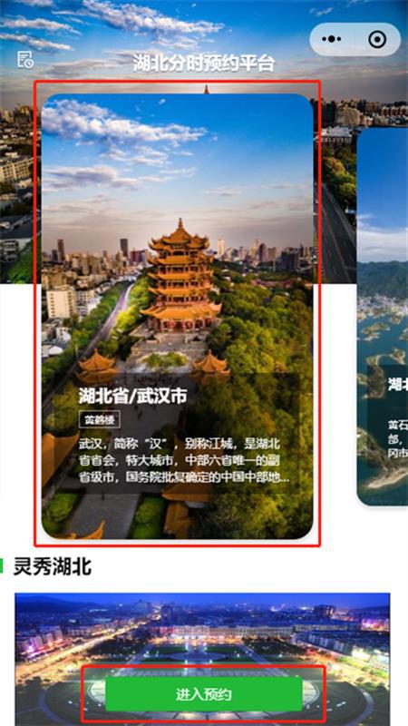 游客通过各应用市场搜索“游湖北”下载APP或通过微信扫描二维码或通过微信搜索“游湖北”小程序,进入预约界面。首页有市一级的宣传图片及基本介绍,点击对应市州图片或者“进入预约”按钮进入景区、文化场馆列表。