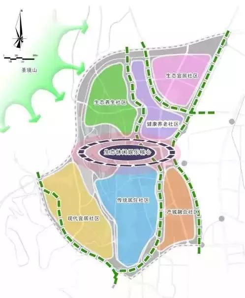 六区:分别为现代宜居社区、传统居住社区、健康养老社区、生态宜居社区、产城融合区、生态养生区。