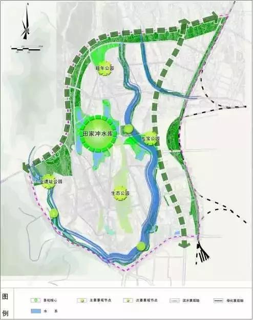 一心:依托田家冲水库及其周边景观绿地,形成规划片区的景观中心;