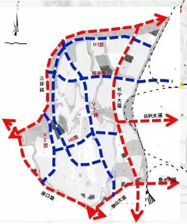 道路:打造“1环(三环线)2横(荆门长兴大道、象山大道—泉水大道)2纵(长宁大道泉口路)”的外围快速通道,拉通“3横(H1、杨冲路(H3)、H5)2纵(V2、V7)”片区内部集散通道。