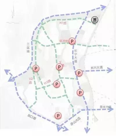 停车场:结合公共服务设施及商业服务设施设置,将建设7个社会停车场,总用地面积4公顷。同时,各新建地块均配建停车场。在长宁大道西侧规划建设一处公交首末站,占地面积2.9公顷。