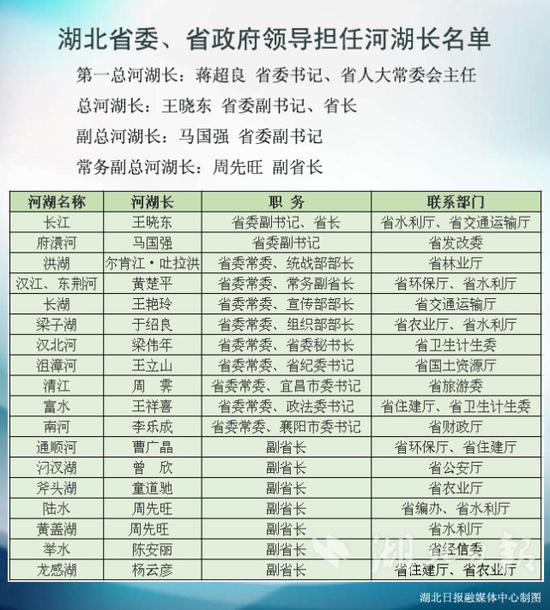 湖北日报讯(记者祝华、通讯员贺俊)近日,省河湖长制办公室印发通知,通知指出,经省委、省政府同意,根据省委、省政府领导班子换届调整情况,对省委、省政府领导担任省级河湖长进行调整。共18名省委省政府领导担任省级河湖长,省委书记、省人大常委会主任蒋超良任第一总河湖长;省委副书记、省长王晓东任总河湖长;省委副书记马国强任副总河湖长;副省长周先旺任常务副总河湖长。