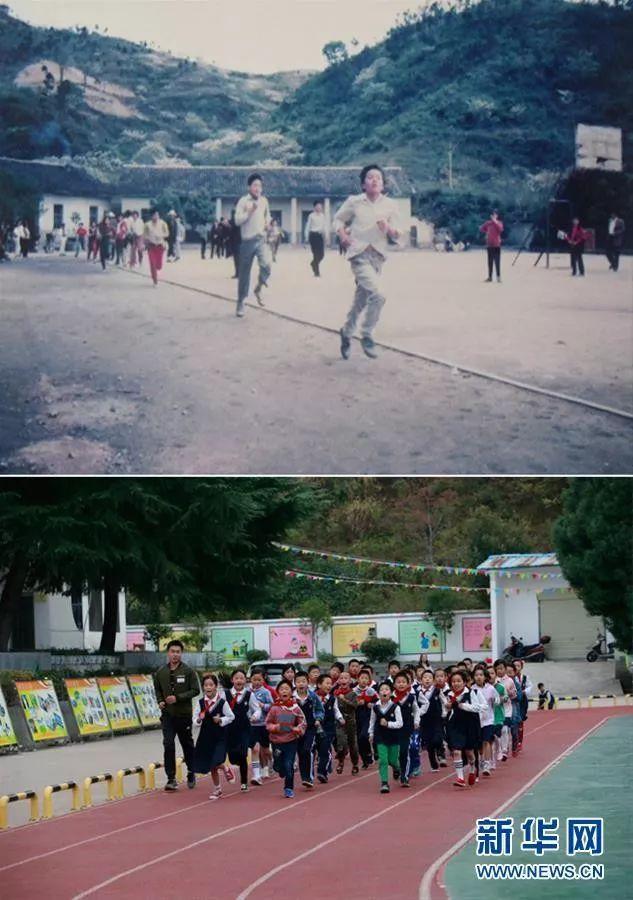拼版照片:上图为罗田县希望小学的资料照片;下图为10月11日清晨,罗田县希望小学学生在老师的带领下晨跑。乡村教师的工作很清苦,往往要身兼数职。但方荣毫无怨言,干劲十足。工作上,她创新了农村小学思政课的模式,经常带学生们走出教室,举办丰富多样的活动。生活上,她像大姐姐一样,和学生们打成一片。学生们有什么心里话,都爱与方荣聊聊。