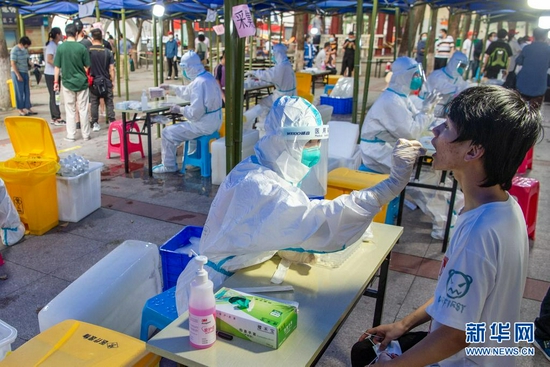 8月3日,市民在武汉市东湖风景区华侨城社区检测点进行核酸检测取样。新华社记者 熊琦 摄时隔400多天,缘何再启全员核酸检测?