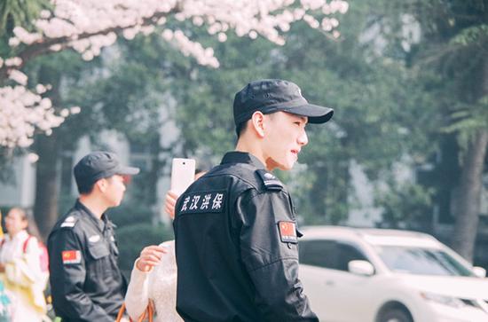贺队长称,当日他们派了30名保安在武大校园执勤,当樱花全部盛开后,会抽调150名保安维持秩序,很多保安都很年轻,颜值也很高。