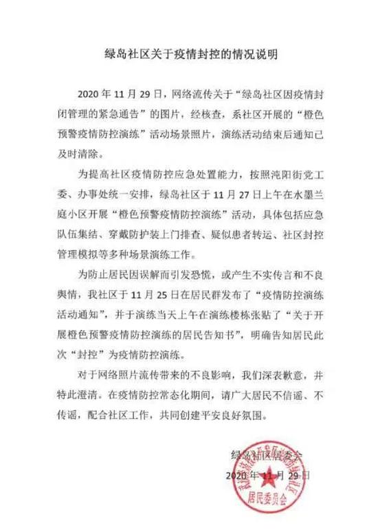 绿岛社区表示,对于网络照片流传带来的不良影响,社区深表歉意,特此澄清。请广大居民在疫情防控常态化期间,不信谣、不传谣,配合社区工作,共同创建平安良好筑围。