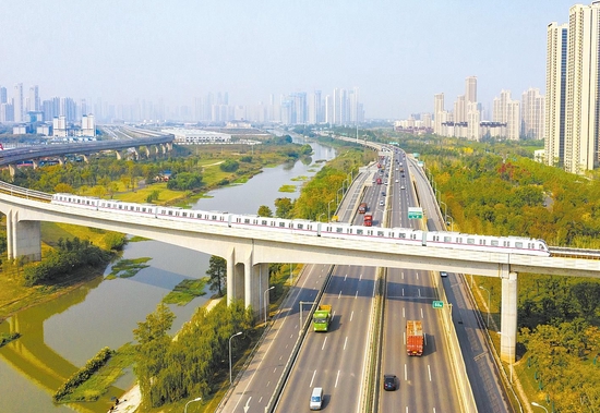 武汉黄家湖畔,地铁五号线全自动列车在横跨三环线和青菱河的高架桥上行驶。 (湖北日报全媒记者 魏铼 摄)
