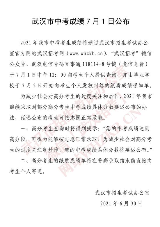2021年武汉市中考考生成绩将通过武汉市招生考试办公室官方网站武汉招考网(www.whzkb.cn)、“武汉招考”微信公众号、武汉电信号码百事通118114-8号键(免信息费),于7月1日中午12时向考生个人提供查询,并由毕业学校于7月2日开始向考生个人发放封签的纸质成绩通知单。