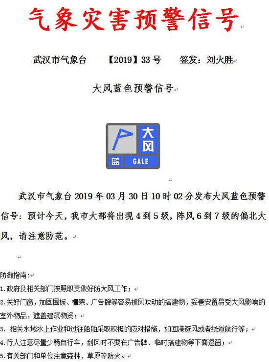 武汉市气象台2019年03月30日10时02分发布大风蓝色预警信号:预计今天,我市大部将出现4到5级,阵风6到7级的偏北大风,请注意防范。