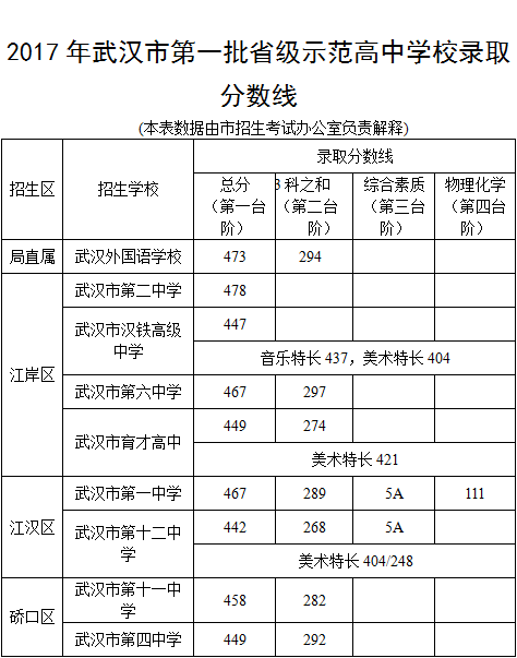 例如:武汉市第一中学录取线为:总分467,3科之和289,综合素质5A,物理化学111,即表示468分以上或467分且语数英3科之和大于289分,或3科之和等于289分且综合素质为5A同时物理化学分数不小于111分可录武汉市第一中学。
