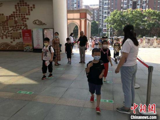 28日上午,武汉育才可立小学学生有序返校熟悉校园环境 张芹 摄当日上午8时左右,记者在武汉市育才可立小学看到,该校二、三、六年级学生分批返校,校门前设置围栏,学生排成两纵队,保持间隔依次通过红外测温仪后进入校园。校园内设有洗手池,学生根据事先安排好的行进路线直接进入班级。