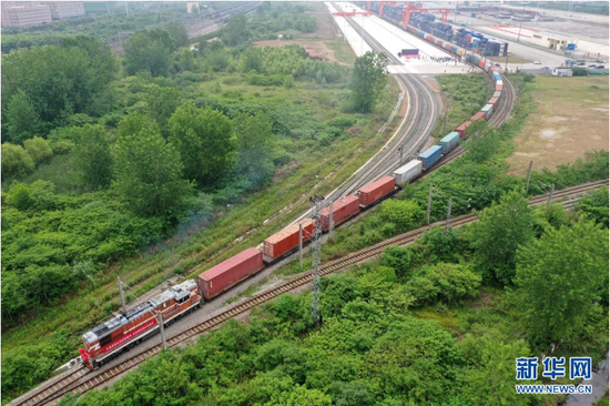 5月20日,开往哈萨克斯坦阿拉木图的班列从武汉吴家山站驶出(无人机照片)。新华社发(彭琦摄)据介绍,武汉至哈萨克斯坦中亚班列这种直达的运输模式,减少了湖北武汉出口产品在西安、郑州中转环节,为企业节约了运输成本,运输时间也将压缩5天至7天。下一趟从武汉开出的中亚班列计划于6月上旬开往乌兹别克斯坦塔什干。
