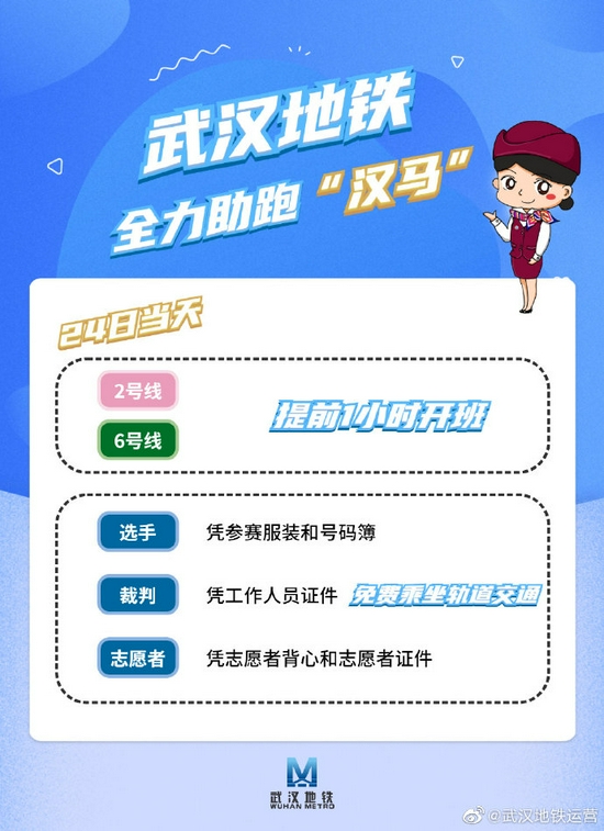 原标题:武汉地铁全力助跑“汉马”丨2、6号线提前1小时开班,选手、裁判、志愿者可免费乘车