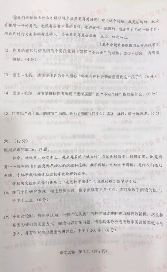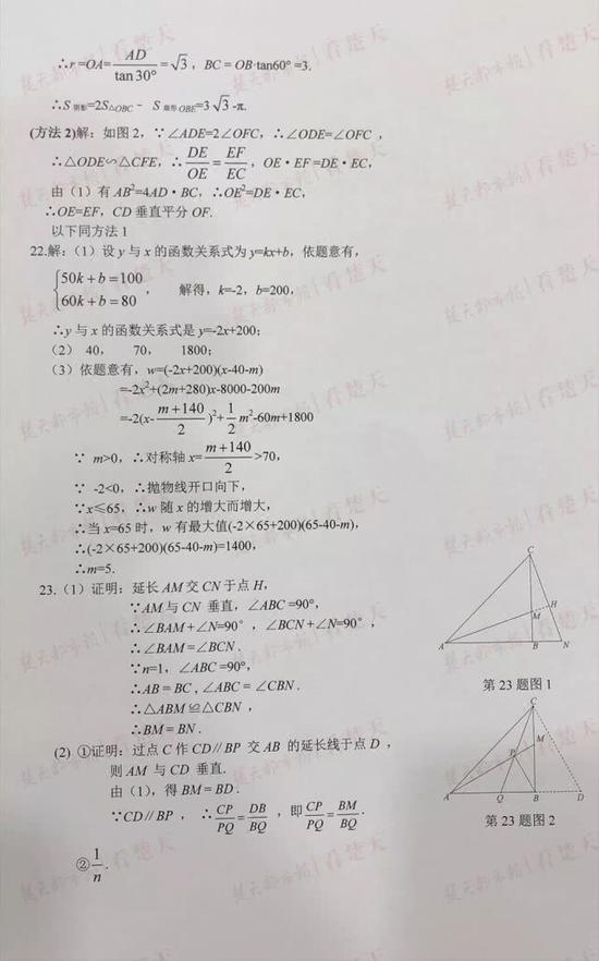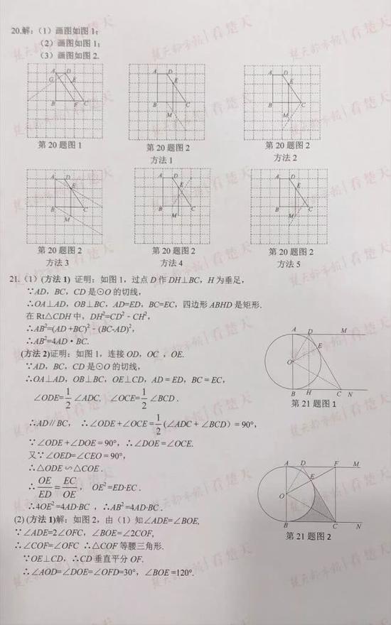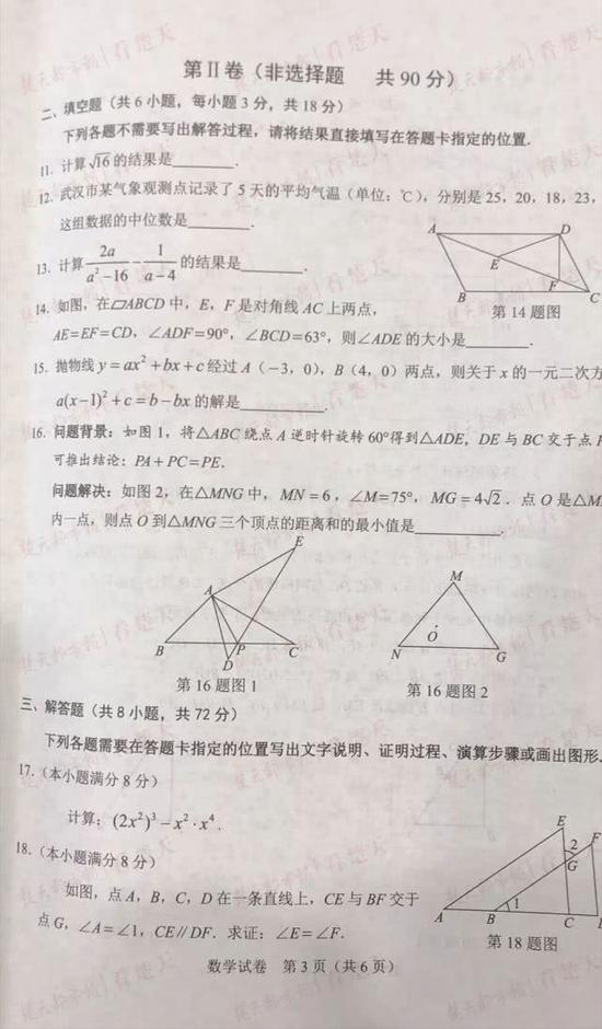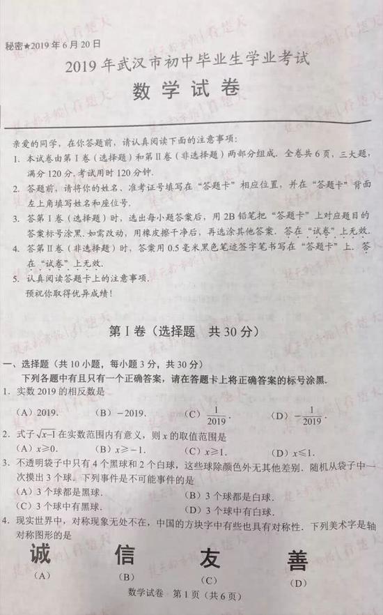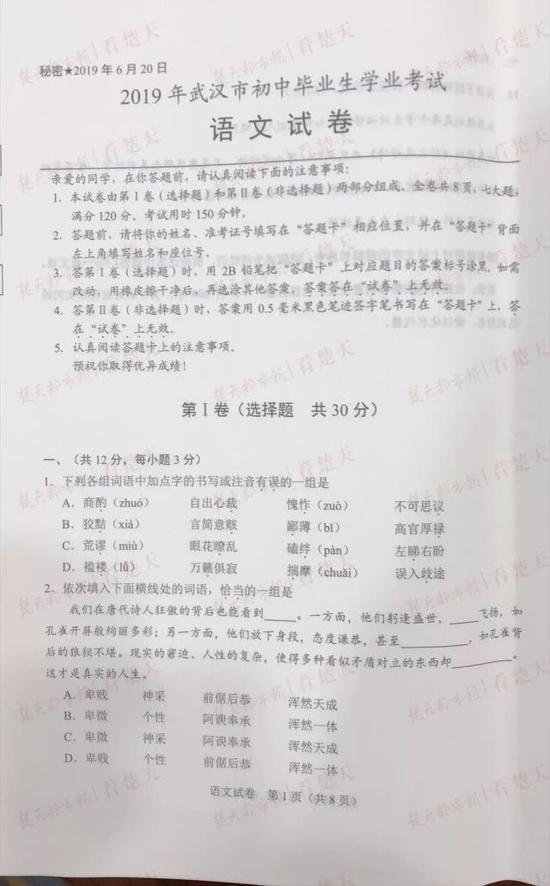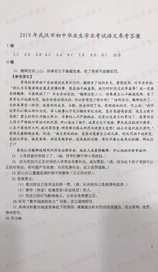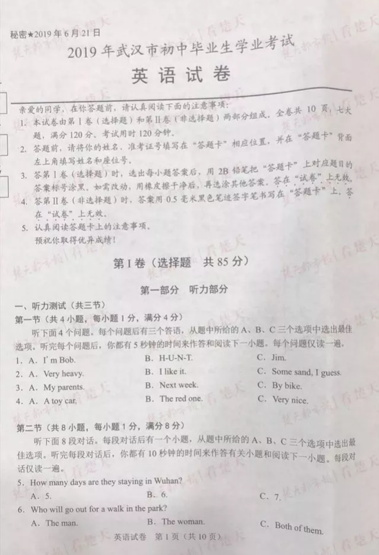 武汉中考试题及参考答案,供考生们参考、估分