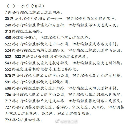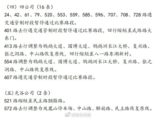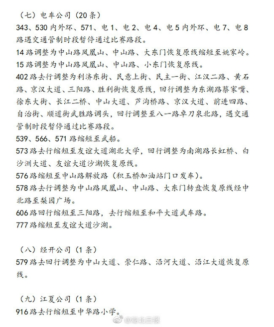 2021武汉马拉松赛将于10月24日举行,比赛期间部分道路将实行交通管制,分时、分路段禁止机动车通行。从武汉公交集团获悉,比赛期间,武汉公交集团将采取暂停营运、缩短运行、绕行、调整发车间隔、调整车辆停放地点等方式,对途经比赛路段的相关线路进行临时调整,同时在主要路段、路口设置安全服务岗,加强营运秩序现场管理,为广大市民公交出行提供咨询等服务,助力赛事顺利进行。赛事当天,参赛选手凭号码簿、志愿者凭志愿者证件免费乘坐公交车。根据比赛期间交通管制通告要求,公交线路作临时调整(共调整公交线路105条,其中缩短运行58条,绕行24条,遇交通管制暂停营运23条)。具体如下↓↓↓(湖北日报全媒记者黄磊、通讯员张意军、苏丹丹)