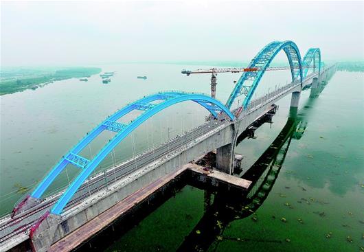 该桥位于崔家营大坝上游1.8公里,是汉十高铁的关键控制性工程,建成后将成为世界上首座时速350公里、最大跨度300米的连续钢构拱桥。(湖北日报全媒记者田悦通讯员王朋摄)