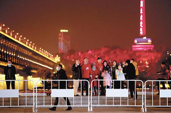 2月11日,农历除夕,夜幕降临,武汉两江四岸变幻莫测的灯光秀映染江面。武汉长江大桥武昌桥头堡下好不热闹,路上车辆川流不息,江边观景台上许多市民和游客举着手机在拍照。