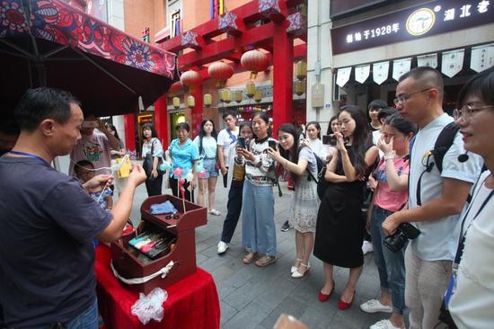 微博大V们一边品尝汉味美食,一边欣赏街头艺人表演。知名旅游博主、微博故事原创作者@凌子看世界在微博中这样写道,“武汉最好吃的几乎都集中在这里,尤其是那些百年老字号。这里不仅有小吃,还有传统的街头表演,汉秀,武汉大鼓,黄梅戏等等。孩子们对吹糖人可是乐此不疲。”