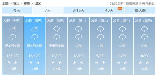 今天恩施地区将由多云转为阴天,局部有小雨,其他地区为晴到多云天气。西部地区高温在17—20℃,东部地区在21—23℃。