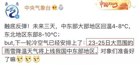 不冷不热,舒适的温度。还没来得及欣赏武汉秋天美景的,赶紧这周末安排起来。但是,享受温暖周末的同时,小编还是决定告诉你们一个坏消息。又一轮冷空气要来 “ 捣乱 ” 了。据中央气象台预报,23-25日大范围的雨雪降温天气将上线我国中东部地区。