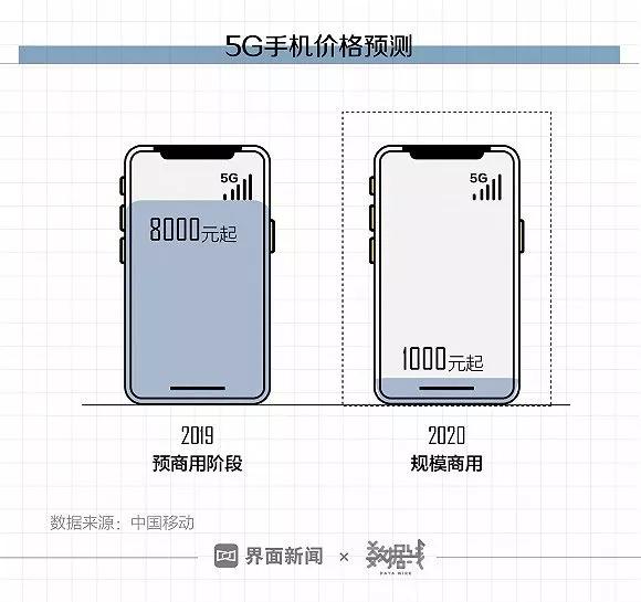 根据中国移动预测,在2019年预商用阶段,5G手机价格会在8000元以上。到2020年规模商用阶段,5G手机价格可能会降至千元级。