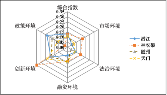 潜江、神农架、随州、天门得分在0.14以下,为第三类地区,中小企业发展环境有待改善。潜江的融资环境指数得分排名比较靠后;神农架、随州、天门在创新环境和政策环境维度方面各有亮点,但与其他市州相比,还存在明显的短板和不足,有较大的提升空间。