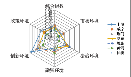 十堰、咸宁、荆门、孝感、恩施、黄冈、仙桃7个市(州)综合指数得分在0.14以上,发展环境在省内处于相对居中的发展态势。十堰和咸宁的五个维度相对较为均衡,各维度指数得分排名均在前十;荆门的短板集中在法治环境建设维度,其他四个维度发展相对均衡;恩施、孝感在法治环境建设方面排名靠前,在创新环境和融资环境建设维度也表现良好;黄冈、仙桃分别在融资环境、市场环境维度表现良好。