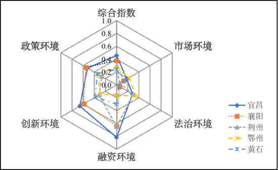 宜昌、襄阳、荆州、鄂州、黄石的中小企业发展环境评估综合指数得分位居前5位,发展环境相对良好,能够为其他市(州)优化中小企业发展环境提供一定的经验借鉴。宜昌、襄阳、黄石在融资环境、创新环境、政策环境建设方面的成就比较明显,但在法治环境维度的指数得分较低;荆州在融资环境和法治环境两个维度的表现较好,但在市场环境和创新环境两个维度表现出不足;鄂州在市场环境和法治环境两个维度的排名位居前列,但在融资环境和创新环境建设方面有待提高。