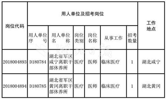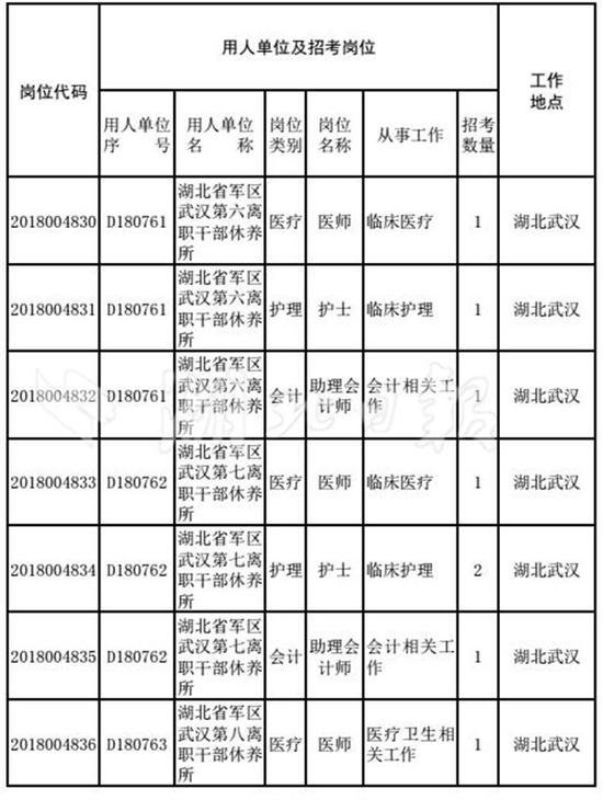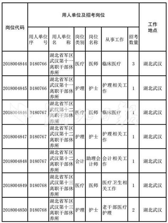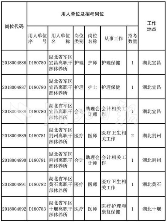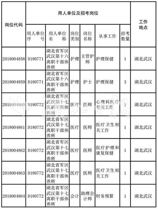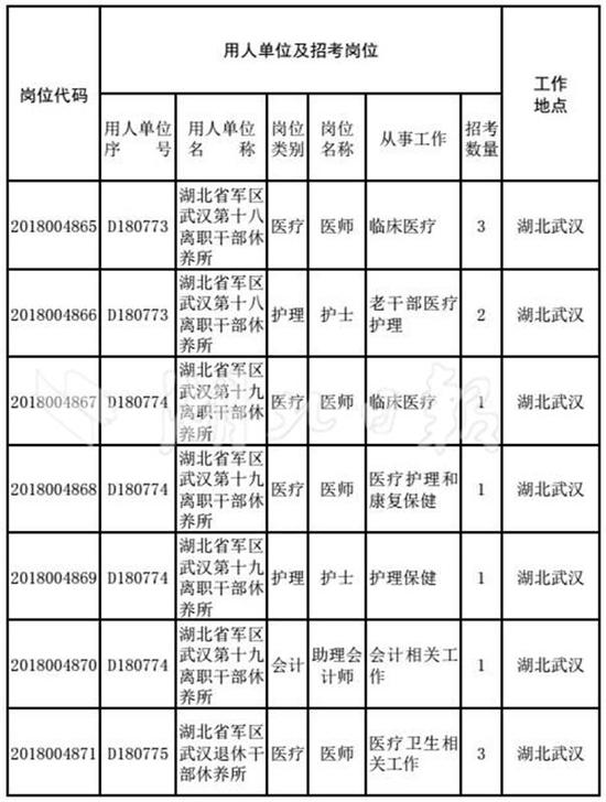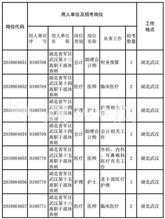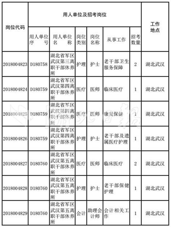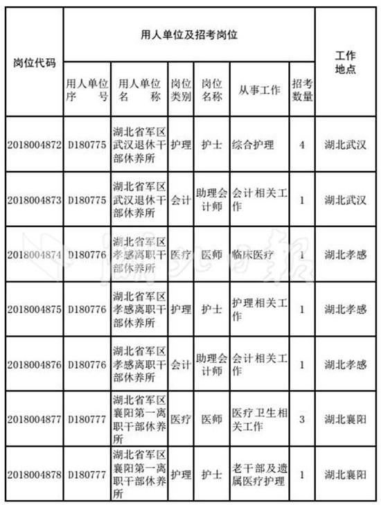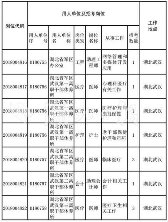 附湖北省军区2018文职人员招聘岗位表(具体招考条件请登录网站查询)