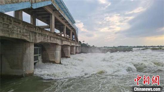 中新网湖北阳新7月13日电 (向能来 马芙蓉)为缓解富河压力,湖北黄石市阳新县网湖分洪闸13日下午1时再次开闸分洪。