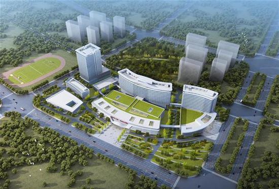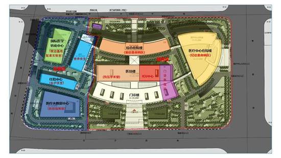 工地入口处看不到高楼和脚手架,首先映入眼帘的便是一幅巨大的院区效果图展示牌,远处可见一根根塔吊臂升向天际。