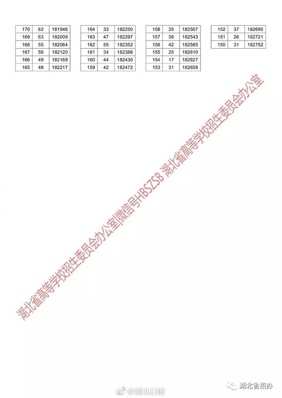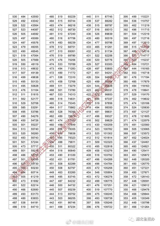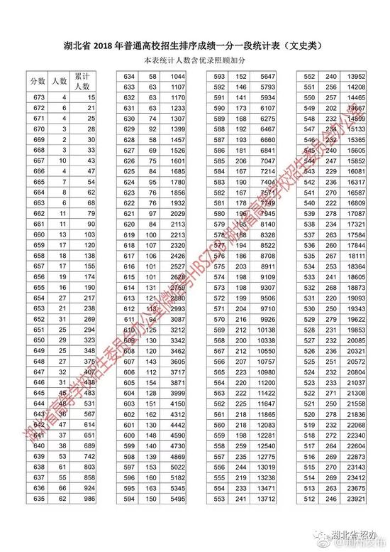湖北省2018年普通高校招生排序成绩一分一段统计表