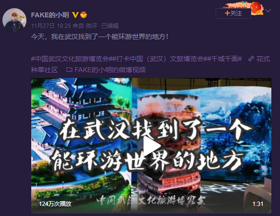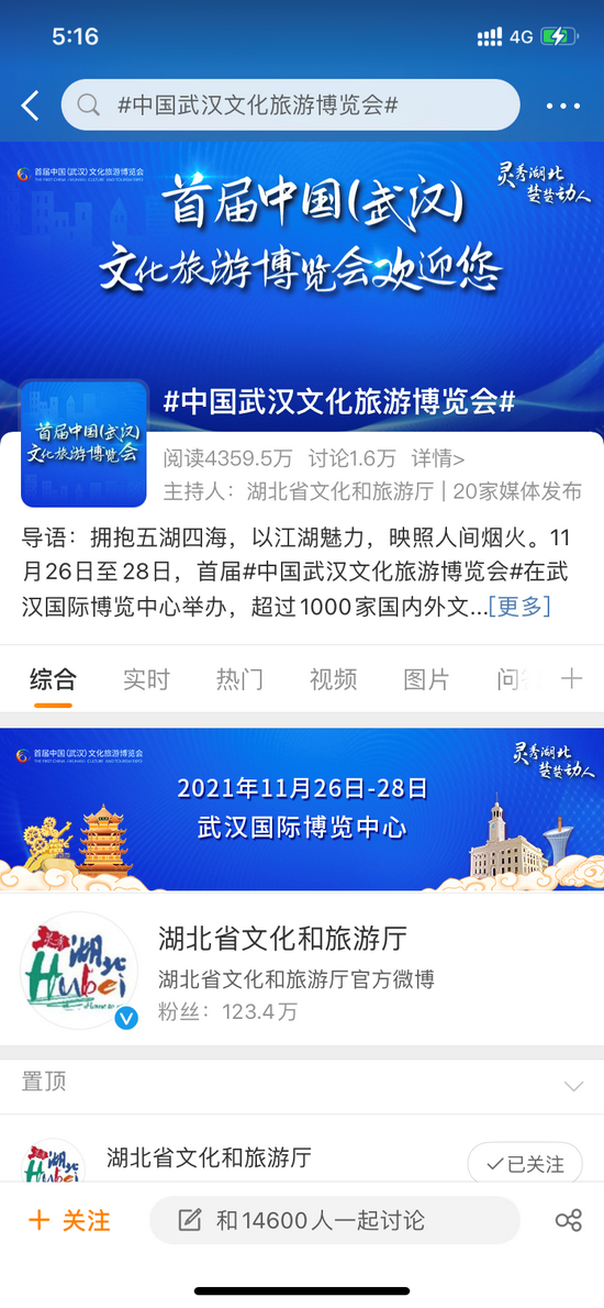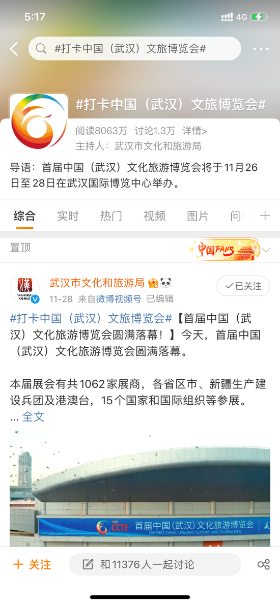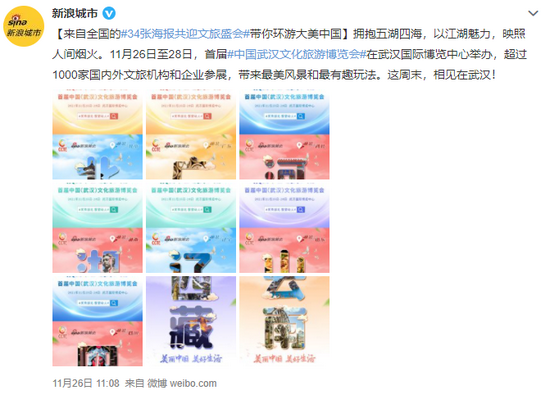 截至11月29日,首届中国(武汉)文化旅游博览会相关话题阅读总量达2.6亿,讨论量达8.5万;直播累计观看量为121万;由@武汉市文化和旅游局 官方微博主持的话题#打卡中国(武汉)文旅博览会#,单个话题阅读量破7760万。