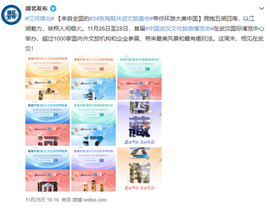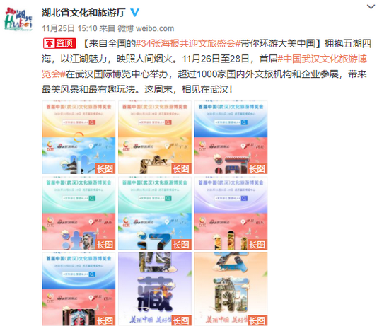 此外,微博湖北还特别联动了@湖北省文化和旅游厅、@湖北发布、@广西文化和旅游厅、@贵州省文化和旅游厅、@新浪城市等全国59个官方微博账号,用34张海报迎接这场文旅盛会。