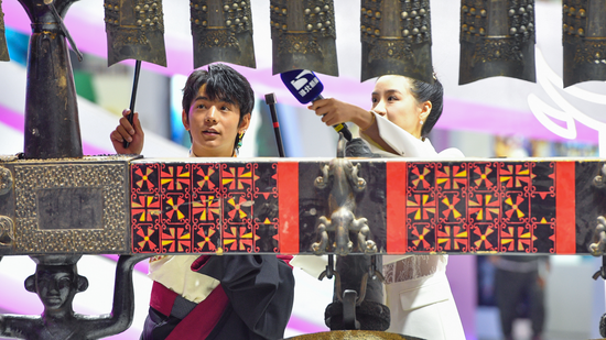 图为丁真在体验敲击编钟。丁俊杰 摄博览会体验官丁真则现场直播体验了敲击编钟、抽盲盒等多个项目。在拆盲盒体验中,丁真抽中了一幅汉绣作品,他表示将带回家乡送给他的小马珍珠。他还用家乡话祝福武汉“吉祥如意,平平安安”。对于湖北的旅游景点,博览会推荐官李子柒表示,自己最想去武汉东湖看一看。李子柒此次带来了自己手工制作的蜀绣、活字章、茶叶、毛笔,这是她首次带自己的作品来到武汉并在线下展示。