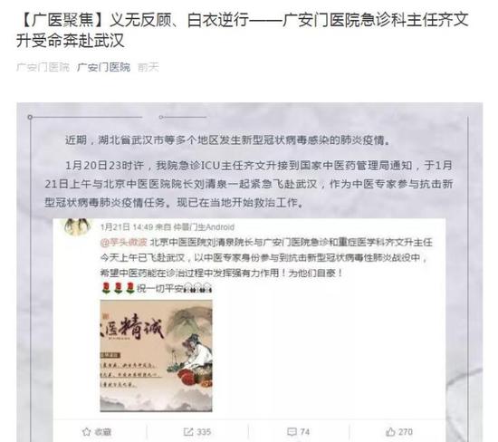 来自北京的医生此前已经抵达湖北展开工作。据广安门医院官方微信,20日23时许,广安门医院急诊ICU主任齐文升接到国家中医药管理局通知,于21日上午与北京中医医院院长刘清泉一起紧急飞赴武汉,作为中医专家参与抗击肺炎疫情任务。