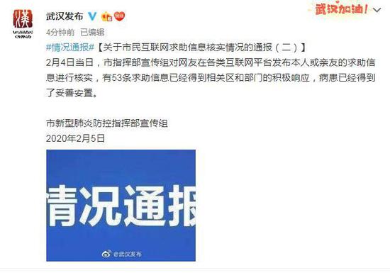中新网2月5日电 据武汉市互联网信息办公室官方微博消息,武汉市新型肺炎防控指挥部宣传工作组5日发布通报称,2月4日当日,武汉市指挥部宣传组对网友在各类互联网平台发布本人或亲友的求助信息进行核实,有53条求助信息已经得到相关区和部门的积极响应,病患已经得到了妥善安置。