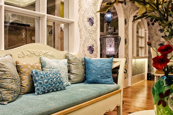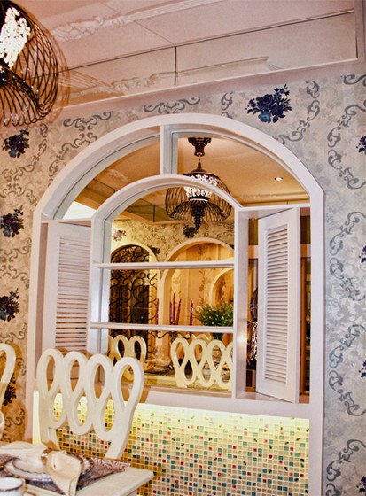 餐厅,用了法式风家居里常用的拱形门窗,象牙白的窗户,窗下半面清新的马赛克背景墙,十分完美地将法式与田园两种迥异的风格糅合到了一起,紫色花朵墙纸与玄关、客厅区域的墙面互相呼应,使餐厅空间与整个家居风格保持了一致。