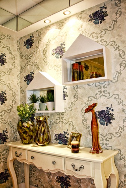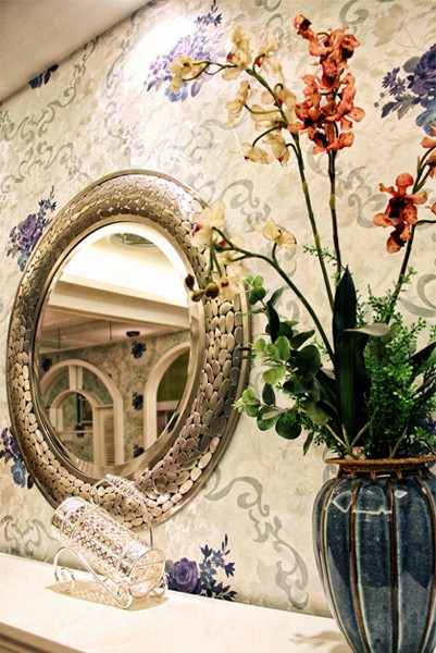 在玄关处设置一面镜子,出门前照照镜子,整理下仪容,把最好最自信的自己展示给每一个人。还有鞋柜上摆放的美丽花束,紫色花朵的墙纸,都让玄关空间瞬间变得高大上起来。