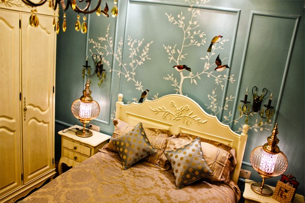 主卧,绿色卧室背景墙上栩栩如生的树鸟画作,给空间增添了不少生气,两盏造型古典的欧式台灯,以及墙上的壁灯都让卧室的风景更加迷人。