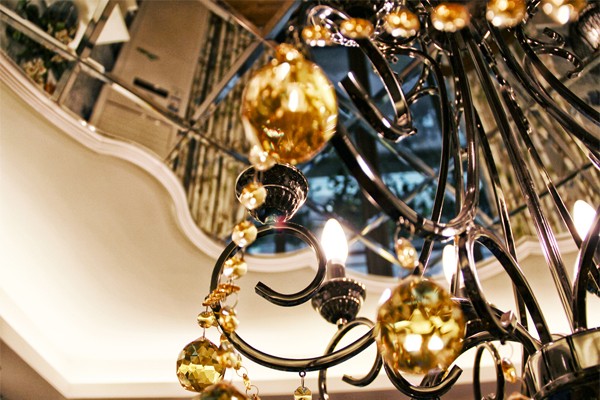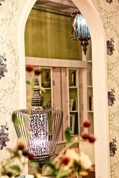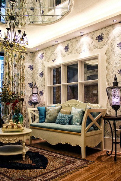至于欧式吊灯、华美茶具、地毯,以及沙发两侧的铁艺灯饰,这些部分便是这个空间之所以能散发出法式韵味的来源了。