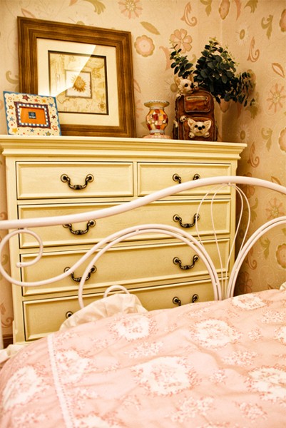 次卧,贴墙摆放欧式小公主床,床头为不规则造型的背景墙,定制了三个拱形收纳口,主要用来摆放小摆件装饰空间,粉色系墙纸同粉色系蕾丝床品互相呼应,又萌又可爱。