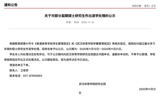 11月13日,武汉体育学院研究生院发布公示,拟对超过最长学习年限的31名硕士研究生作退学处理。
