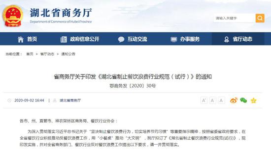 中新经纬客户端9月3日电 据湖北省商务厅官网消息,2日,湖北省商务厅印发《湖北省制止餐饮浪费行业规范(试行)》的通知(以下简称“通知”),通知要求,餐饮经营者禁止设置最低消费。要执行适量点餐提醒提示制度。要主动为消费者提供剩食打包服务,提倡剩食打包积分奖励,对剩食超过一定数量不打包者,增加餐余收费。