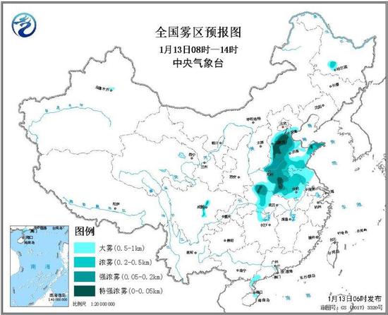 13日早晨至白天,天津、河北中南部、山东、河南中东部、安徽中北部、江苏北部、湖北中部等地有大雾,其中,河北中南部、山东西部和半岛东部、河南中东部、湖北北部等地的部分地区有能见度不足200米的强浓雾,局地有能见度不足50米的特强浓雾。中央气象台于13日06时继续发布大雾橙色预警。另外,13日至14日,华北南部、黄淮、江淮、江汉等地仍有轻至中度霾,部分地区重度霾。14日夜间起,受冷空气影响,上述地区霾过程自北向南逐渐减弱消散。