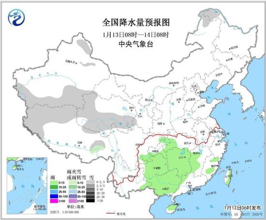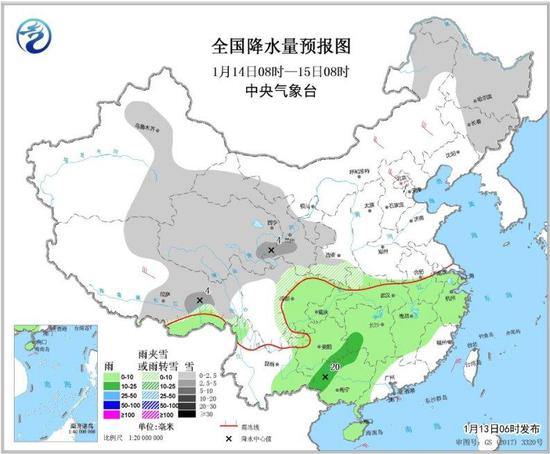 1月13日08时至14日08时,新疆北部和南疆盆地、西藏西部和北部、青海西部和南部等地的部分地区有小雪或雨夹雪,其中,西藏西部局部地区有中到大雪;西南地区东部、江南西部、华南西部等地的部分地区有小雨(见图2)。