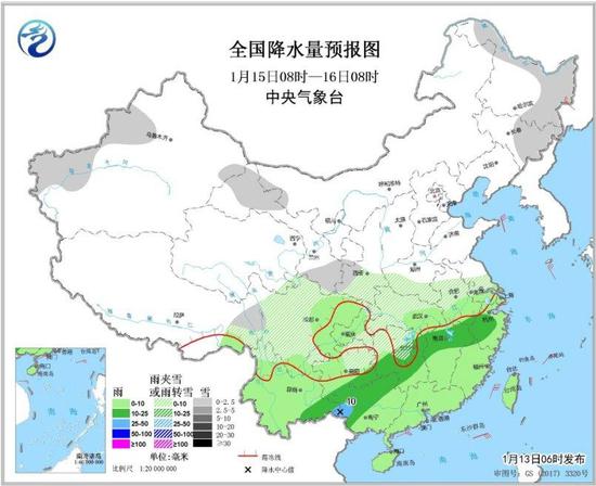 图3 全国降水量预报图(1月14日08时-15日08时)1月15日08时至16日08时,黑龙江东部和北部、吉林东部、新疆西北部、西北地区东南部、川西高原、江淮大部、江汉大部、黄淮南部、江南西北部等地部分地区有小雪或雨夹雪。四川盆地、云南、贵州西部和南部、江南大部、华南等地部分地区有小到中雨,局地有大雨(25~40毫米)(见图4)。